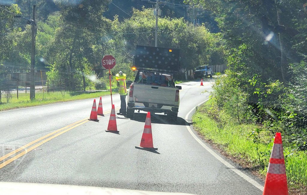 This is exactly what happened last week when we were traveling on a mountain road near Boulder Creek, CA. The flagger even waved us to slow down and we couldn’t understand why. Then, about 30 yards later, it became obvious: a man was kneeling down on the road, working right next to our lane.